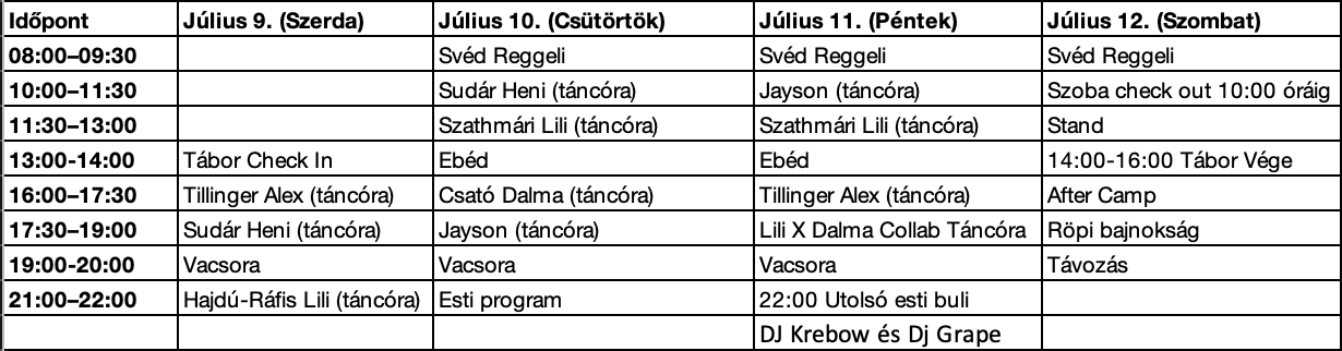 Napi 4 táncóra vár rátok, így sok pólóra lesz szükségetek – biztosan meg fogtok izzadni.